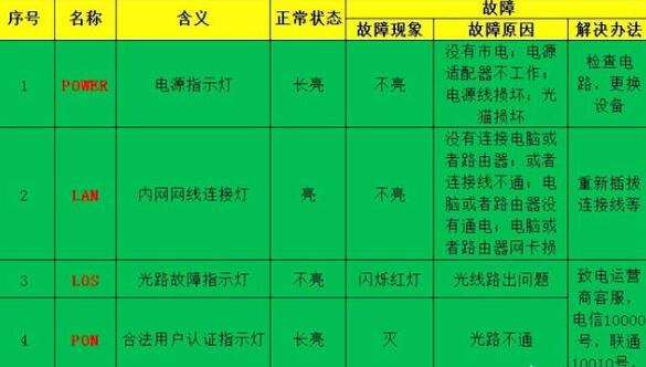 看设备灯状态:自己动手修网,不要着急,可以先了解设备的状态指示灯,到自己家里放置运营商光猫的地方,查看一下,对照下表: